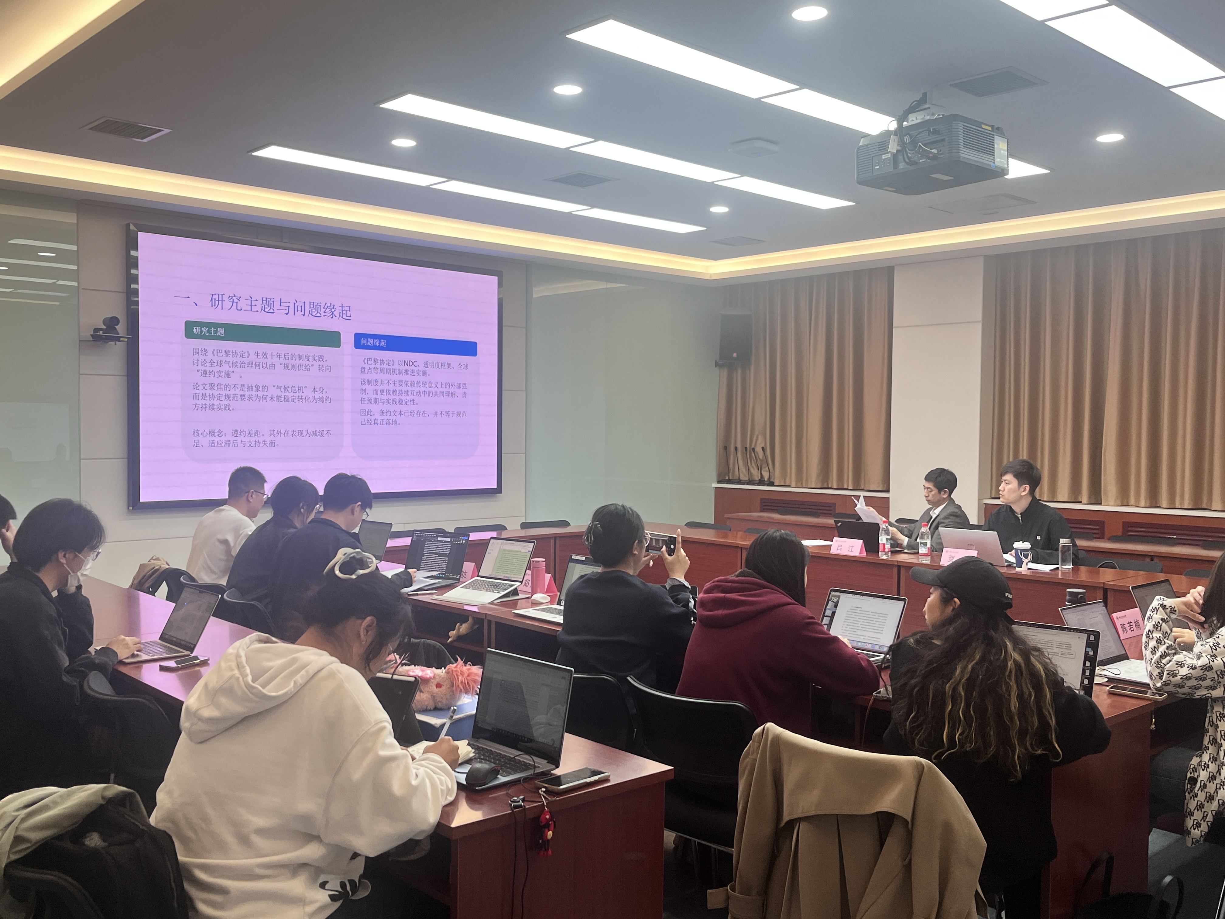 李秀聚焦于《巴黎协定》框架下全球气候治理中的“遵约差距”,从横向互动失灵和纵向传导阻滞等角度分析既有规则难以稳定转化为遵约实践的成因。汇报结束后,与会博士生围绕两项研究的选题价值、问题意识、论证框架和创新之处,同汇报人展开了深入讨论。