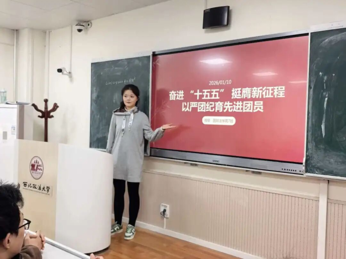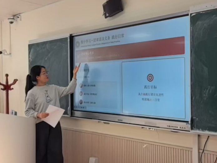 2025级5班副团支书王潞瑶分别从政策解读和思想指引两方面作出了分享。她为同学们解读了党二十届四中全会的主要内容、核心精神,着重分析了习近平总书记对未成年人思想道德建设的重要指示,带领同学们了解了党的自我革命以及团员先进性建设的要求,深化了同学们的理论认知,增强了政治认同。
