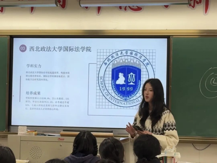 天津市南开中学滨海生态城学校的宣讲团队围绕学校办学底蕴、学科优势及人才培养特色,系统介绍了西北政法大学的法学教育资源和涉外法治特色专业,重点解读了学院涉外法治特色专业与国际化培养方向。队员们结合自身学习经历,分享了个人成长收获,帮助同学们真切感受到西北政法大学的法学专业魅力。宣讲过程中,团队细致解读了近年招生政策、录取情况与专业选择策略,为同学们提供了科学的学业规划参考。