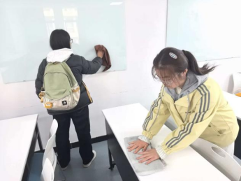与此同时,2025级4班团支部也在团委带领下积极投入到教室清扫整理专项行动中去。志愿者们分工协作、配合默契,俯仰之间擦拭黑板讲台,细致入微清扫地面纸屑,认真规整每一处公共物品,合力清除墙面上的污渍痕迹。汗水与专注交织,责任与热忱同行,他们齐心协力,将教室的每一寸角落都当作共同守护的家园。窗明几净间,书香更显浓郁,雷锋精神也在这一方小小的学习天地悄然扎根、默默生长。