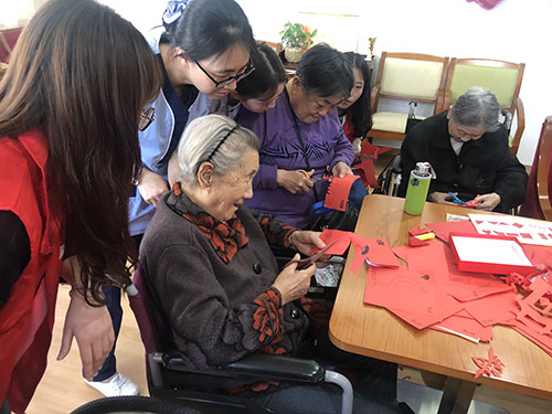 皇冠体育官网 多年贯彻“厚泽陕西”的精神,始终不忘在自己的能力之内服务社会。在此次活动中,同学们精心准备了剪纸素材,与敬老院的老人们共同完成了几十样剪纸作品。老人们对剪纸抱有极大的热情,同学们也耐心地进行讲解,鼓励老人们动手完成剪纸作品。同时老人也和同学们热情分享自己的青年往事,同学们从精彩的故事中受益匪浅。活动最后,志愿者们为老人献上亲手制作的贺卡,上面写满了对老人们的祝福。