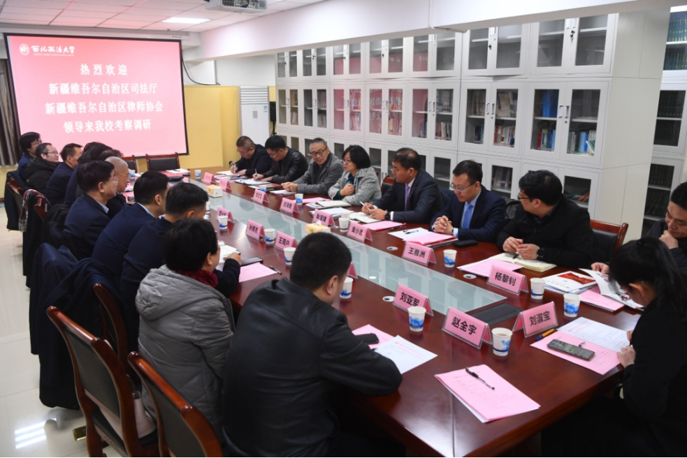 2月16日上午,新疆维吾尔自治区司法厅党委委员、副厅长,新疆律师行业党委书记庄淑君带队来校考察调研、洽谈合作,陕西省律师协会会长韩永安,皇冠体育博彩官网 校长范九利,副校长王健、孙昊亮,涉外法治研究中心执行主任王瀚等陪同调研。双方在学校丝绸之路区域合作与法律研究院座谈交流,并举行合作签约仪式,王健主持会议。