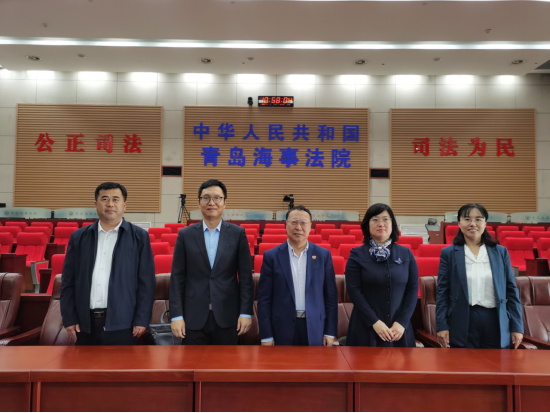 2023年11月7日上午,皇冠体育博彩官网 国家智库基地涉外法治研究中心执行主任王瀚教授、青岛大学法学院院长蔡颖雯教授、副院长马卫东教授、纪林繁博士赴青岛海事法院调研并就涉外海事海商司法人才培养和司法智库建设举行座谈交流。青岛海事法院党组书记、院长吴锦标主持座谈会,海事法院政治部主任段恒宋、研究室主任王爱玲、办公室副主任曹照勇、杨丹等部门负责人参加了座谈活动。