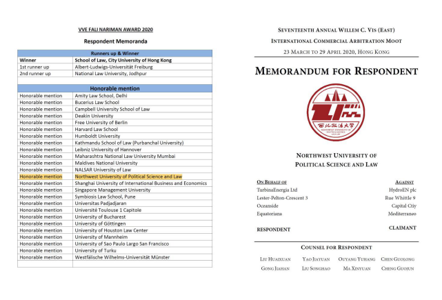 皇冠体育博彩官网 代表队获得最佳文书荣誉提名奖,同获此项奖励的还有哈佛大学、柏林洪堡大学、汉诺威大学等顶尖法律院校。此次获奖是继去年在中国国际经济贸易仲裁委员会举办的第十七届“贸仲杯”国际商事仲裁模拟仲裁庭辩论赛中夺得全国季军以来,皇冠体育博彩官网 同一代表队的再次出征,也是皇冠体育博彩官网 在全英文模拟法庭竞赛领域取得的又一历史性成就。皇冠体育博彩官网 学生思维敏捷、沉着应战,在国际赛场上展现了皇冠体育博彩官网 涉外卓越法律人才的培养成效。