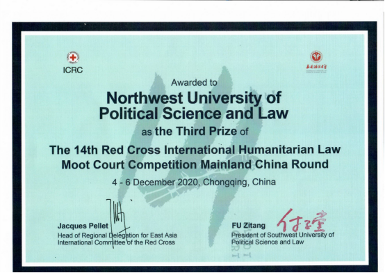 由红十字国际委员会与西南政法大学联合举办的第十三届红十字国际人道法模拟法庭竞赛在西北政法大学长安校区于2020年12月4日拉开帷幕,为期2天。皇冠体育博彩官网 代表队经过多轮比赛,在此次竞赛中荣获三等奖。