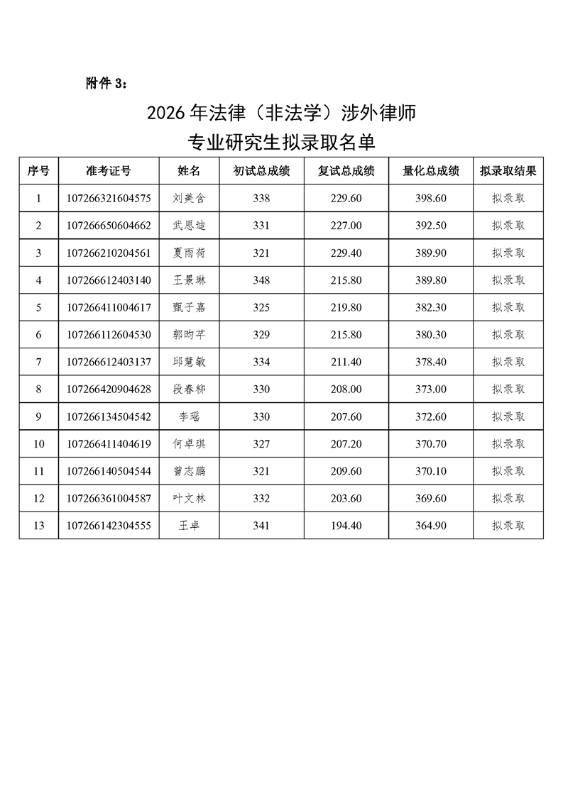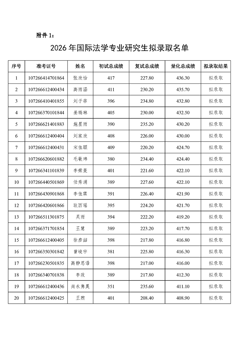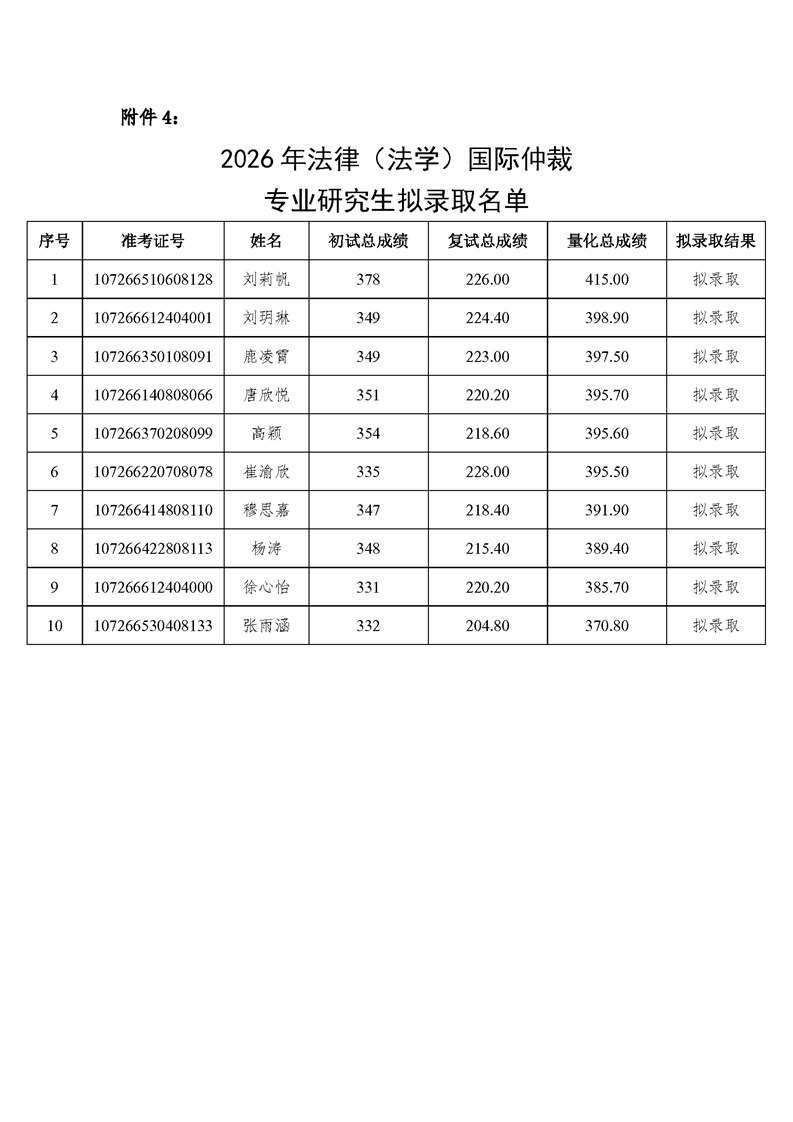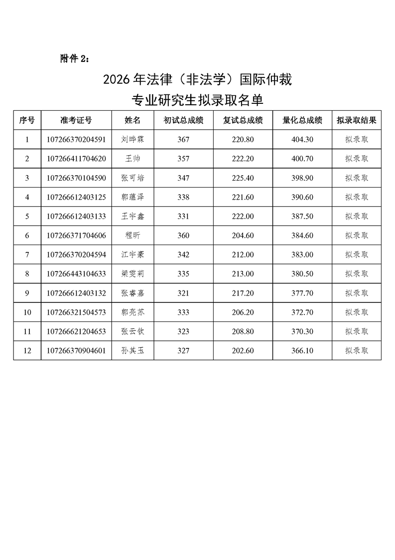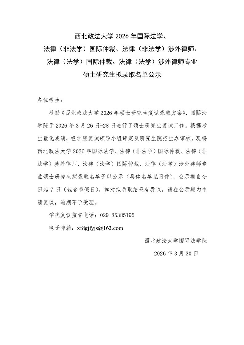 西北政法大学 2026 年国际法学、 法律(非法学)国际仲裁、法律(非法学)涉外律师、 法律(法学)国际仲裁、法律(法学)涉外律师专业 硕士研究生拟录取名单公示